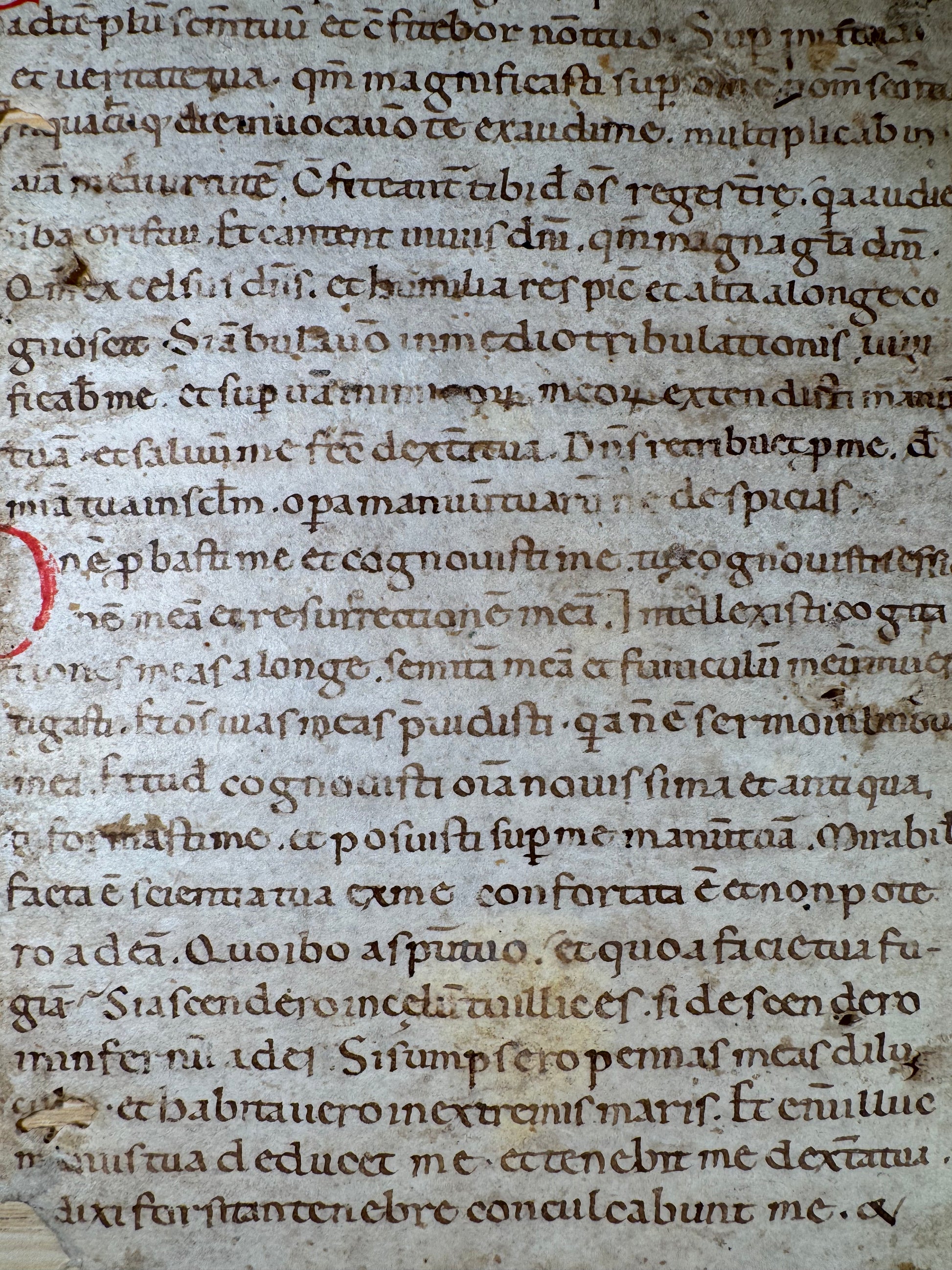 Recovered from a later book binding, the fragment bears evidence of age and reuse, including toning and wormholes, yet the text remains impressively legible. The leaf includes a portion of Psalm 122, used in processional liturgy: “Laetatus sum in his quae dicta sunt mihi…”