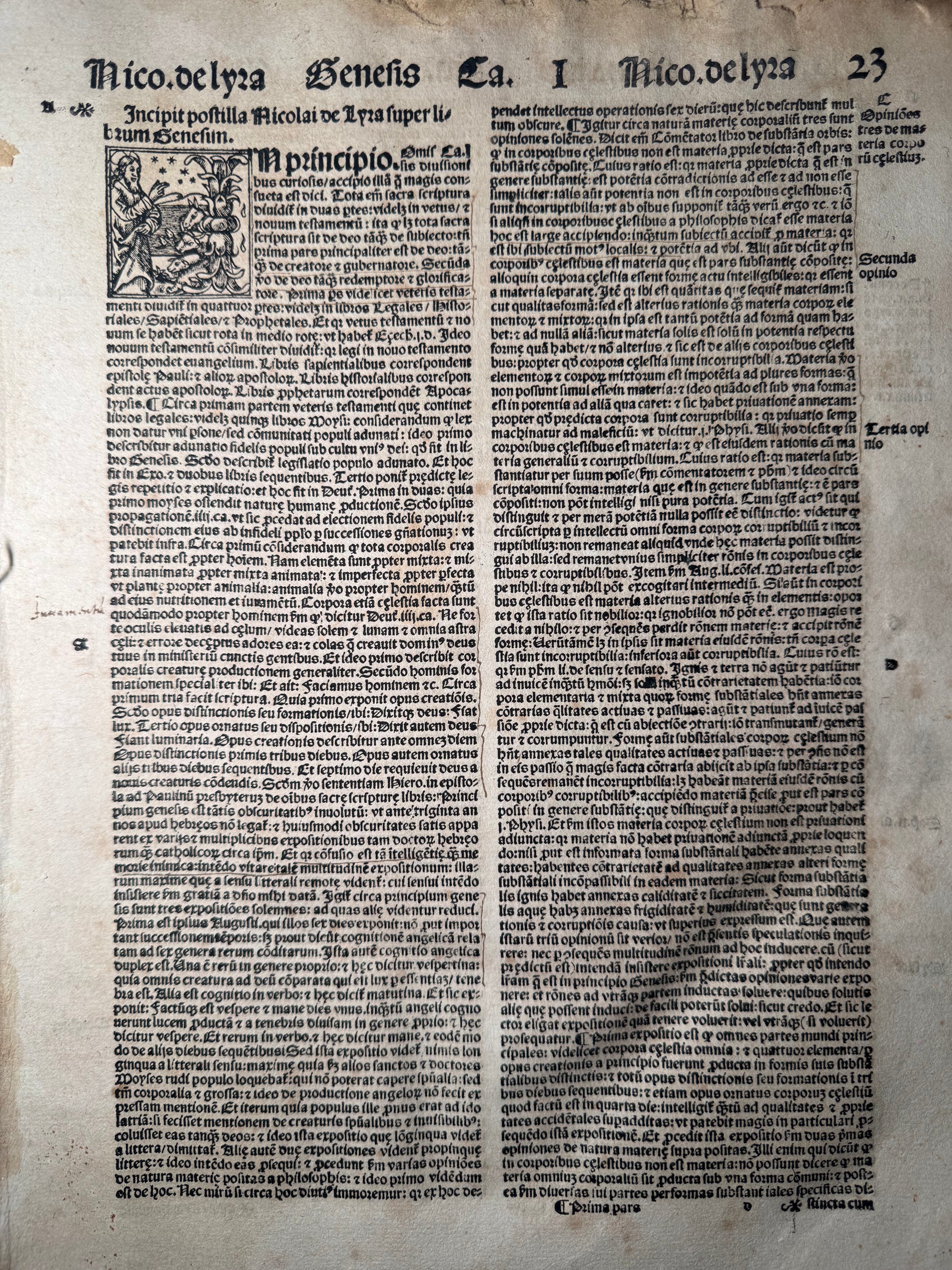 Nicolas de Lyra (c. 1270–1349) was a Franciscan scholar whose biblical commentaries profoundly influenced later theologians — including Martin Luther, who drew heavily upon Lyra’s notes during the Reformation. Editions like this 1528 Lyon printing represent the final flowering of the medieval Bible tradition, where sacred text and gloss were still presented side-by-side before the typographical reforms of the later 16th century.