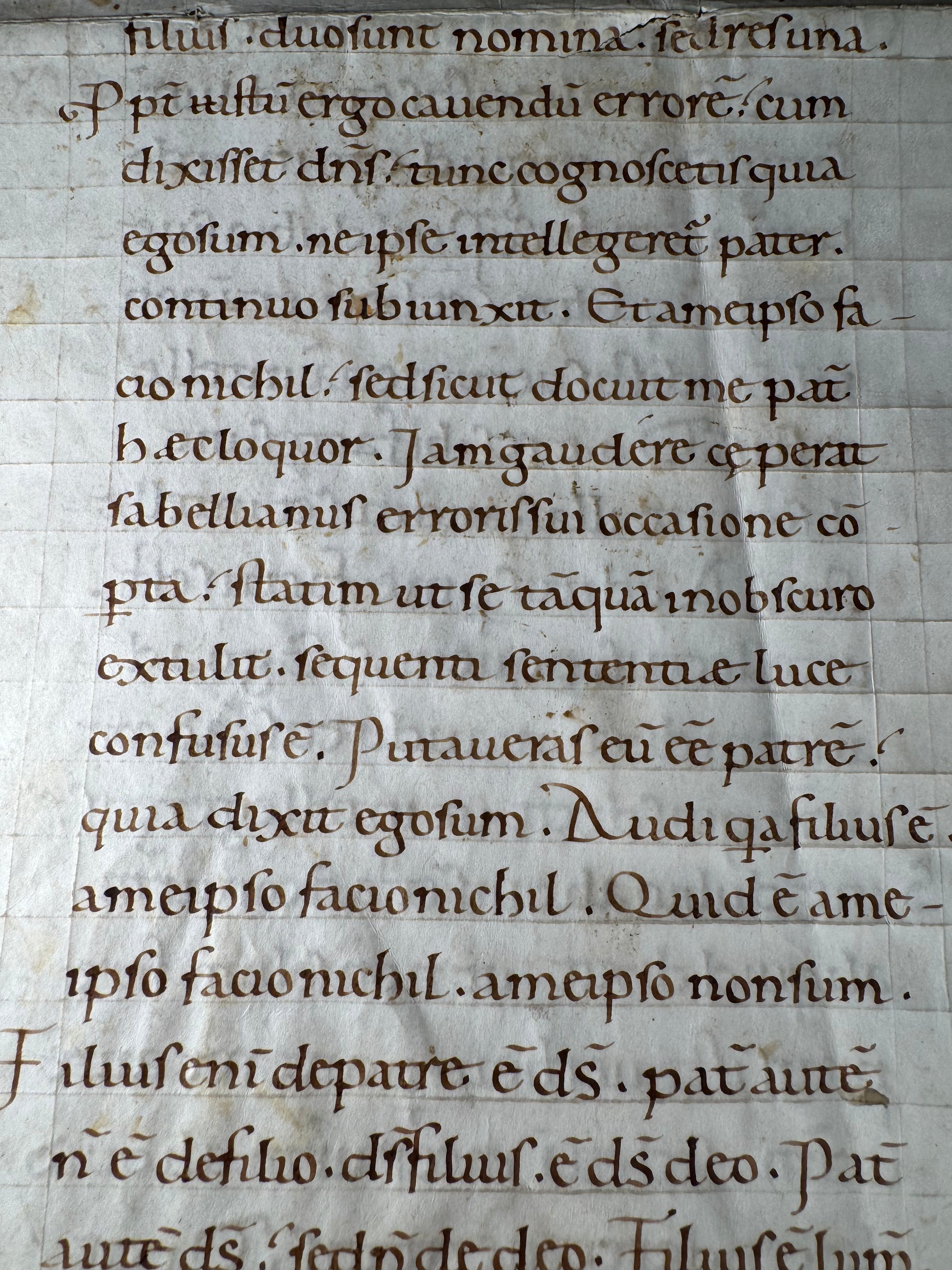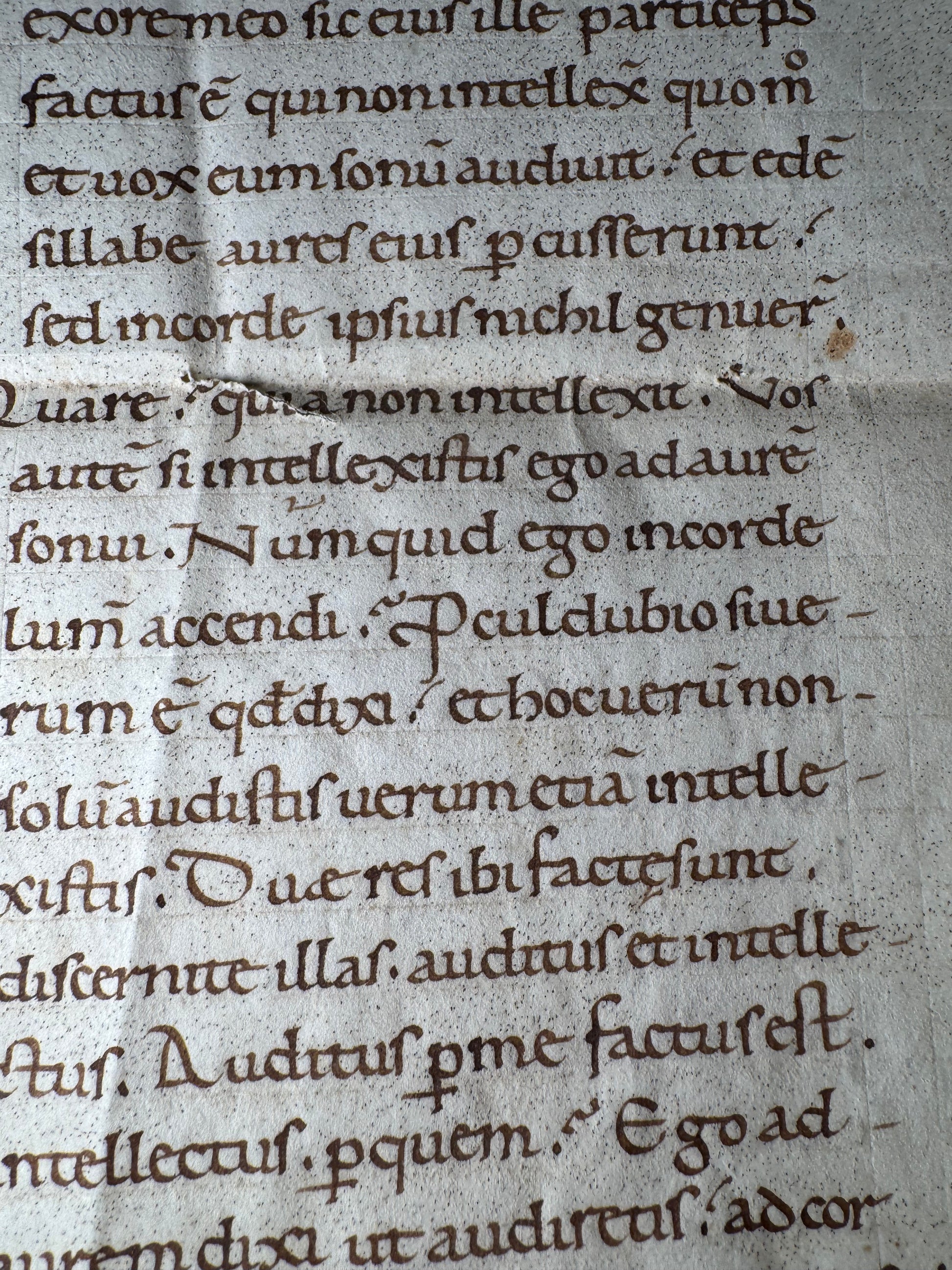 This is an incredible and large manuscript from Augustine’s Sermon 71. It dates to the 11th century and is likely from Italy. I worked with Eugenio Donadoni at Christie’s and he confirmed that that information is correct. It measures 16 inches tall at its highest point and 11 inches wide.