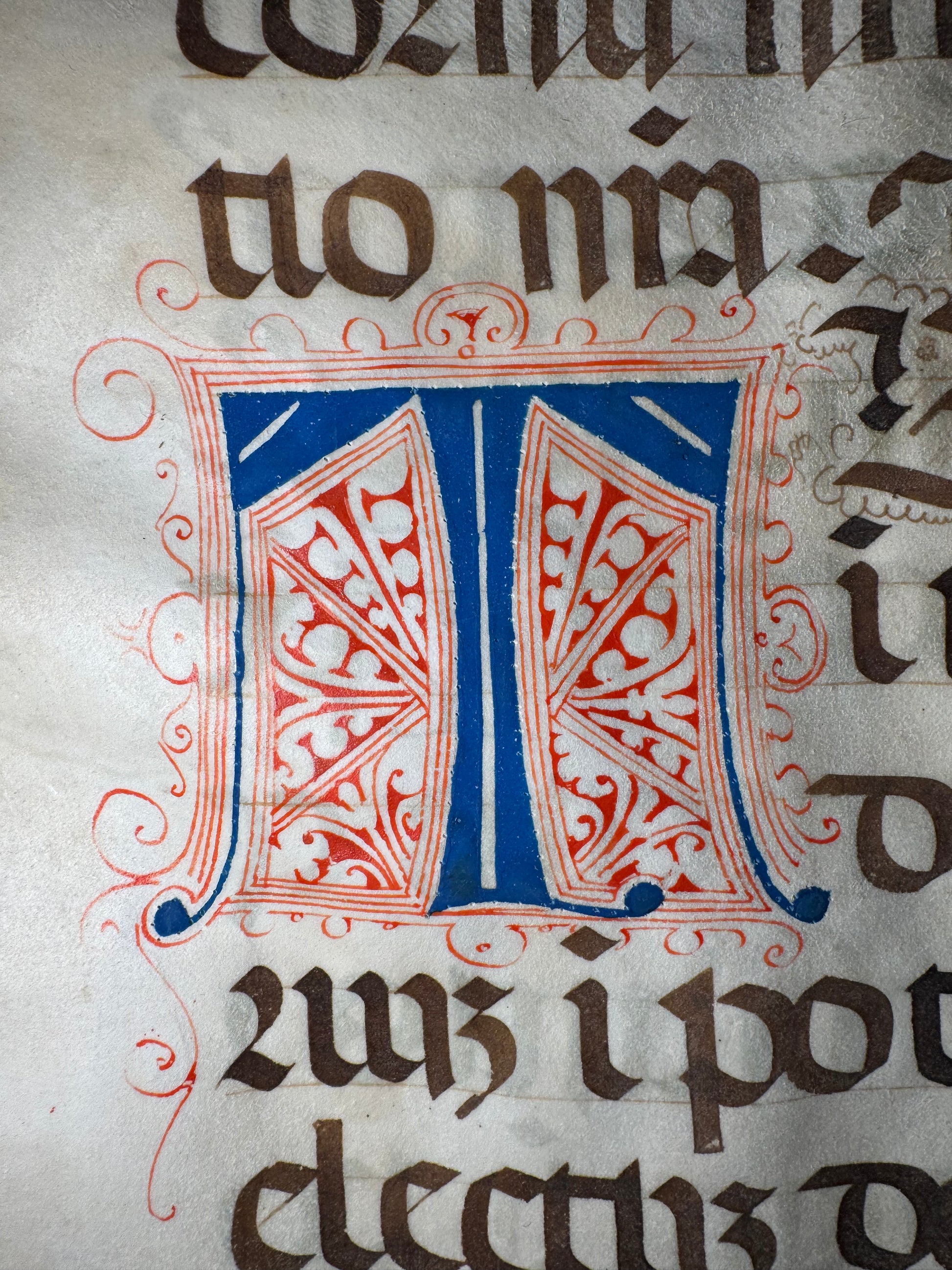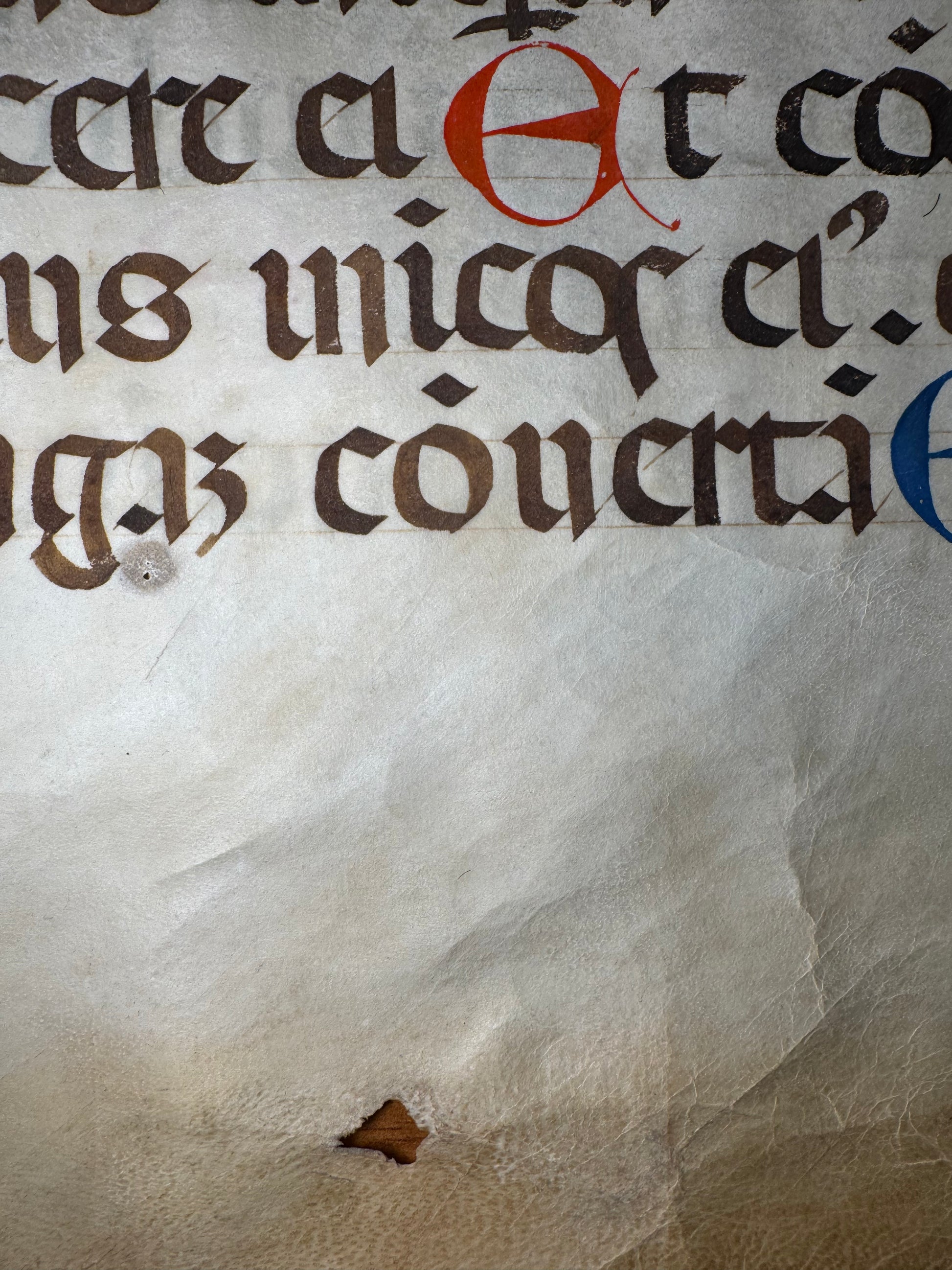 Expertly scribed on high-quality vellum, this leaf remains in excellent condition for its age, with crisp lettering, vibrant initials, and minimal wear. Its impressive size and legibility reflect its original purpose: to be read aloud by a group of singers standing at a distance.