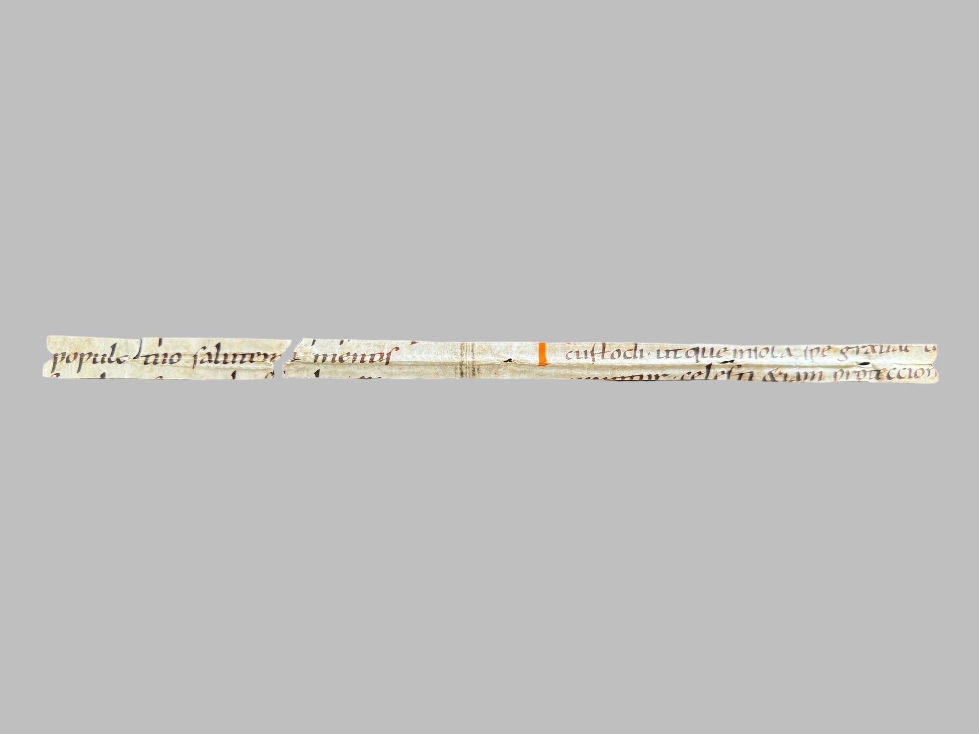 This narrow strip of parchment once formed part of a large liturgical manuscript (likely a Missal or Sacramentary) produced in a Swiss or German scriptorium, quite possibly St. Gallen Abbey, one of the greatest centers of Carolingian learning and book production. The fragment was later recycled as binding material in a ca. 1485 Basel incunable, where it remained hidden for centuries before being recovered.